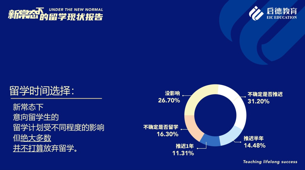 《啟德教育新常態(tài)下的留學(xué)現(xiàn)狀報告 》調(diào)研數(shù)據(jù)顯示,疫情與國際環(huán)境疊加的“新常態(tài)”中,意向留學(xué)生的留學(xué)計劃不同程度地受到了影響,但大部分的意向留學(xué)生并不打算放棄留學(xué),而主要是在時間規(guī)劃上進行了調(diào)整。參與調(diào)研的意向留學(xué)生中,31.2%表示不確定是否推遲留學(xué)計劃,26.7%表示沒有影響,14.48%將留學(xué)計劃推遲半年,11.31%將留學(xué)計劃推遲一年,16.3 %表示不確定是否繼續(xù)留學(xué)(這之中初中階段的學(xué)生較多)。