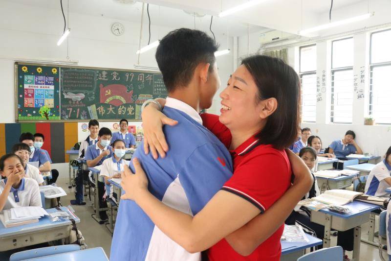 坪山同心外國(guó)語(yǔ)學(xué)校授課老師加油打氣:和語(yǔ)文老師擁抱,考試滿(mǎn)分! (焦子宇 耿超逸文/圖)