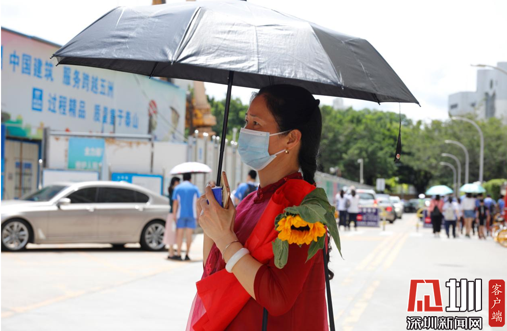 一位拿著旗幟和向日葵望著考點(diǎn)的家長(zhǎng)。