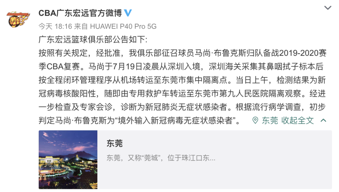 7月19日,廣東新增境外輸入無癥狀感染者1例,為東莞報告,來自美國,在入境口岸發(fā)現(xiàn)。經(jīng)確認(rèn),此人是CBA廣東宏遠(yuǎn)男籃外援馬尚·布魯克斯。