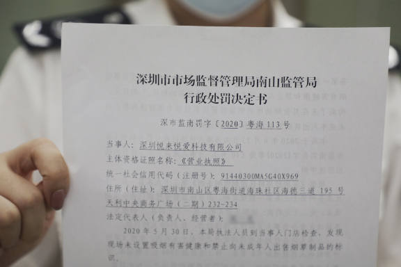 經(jīng)過近2個(gè)月的調(diào)查,7月21日,深圳悅來悅愛科技有限公司正式簽收深圳市市場監(jiān)督管理局南山分局粵海所開出的行政處罰決定書,罰款2000元。