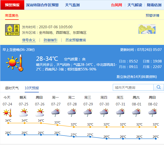 見圳客戶端·深圳新聞網2020年7月24日訊(見圳客戶端、深圳新聞網記者 陳婕 鄭曉鵬)老天熱“晴”不斷,今明兩天悶熱加劇。24日晴天間多云,天氣悶熱;氣溫28-34℃,中北部再高1-2℃;偏南風3級;濕度55%-90%。25日晴天間多云,最高氣溫34-35℃,中北部可達36-37℃。26日持續(xù)晴熱,局地有短時(雷)陣雨;27-29日多云,有短時(雷)陣雨;30日有陣雨或雷陣雨。