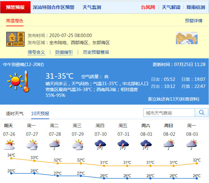 深圳市氣象局預(yù)計今明兩日深圳(含深汕)高溫天氣持續(xù),最高氣溫可達(dá)34-36℃;27-31日轉(zhuǎn)雷雨天氣,高溫天氣略有緩解,其中27-28日多云,有短時(雷)陣雨;29-31日有雷陣雨。