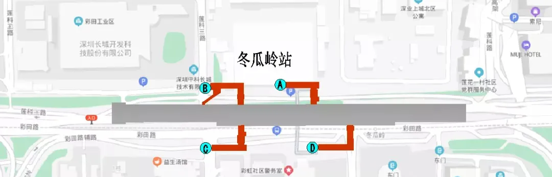 冬瓜嶺站地處福田區(qū)天威視訊附近,車站沿規(guī)劃福田彩田路南北向布置,車站為地下二層一島一側(cè)式站臺鋼筋混凝土箱形框架結(jié)構(gòu)。車站共設(shè)出入口7個(gè):A、B、C、D、3個(gè)物業(yè)出入口(E、F、G口)。