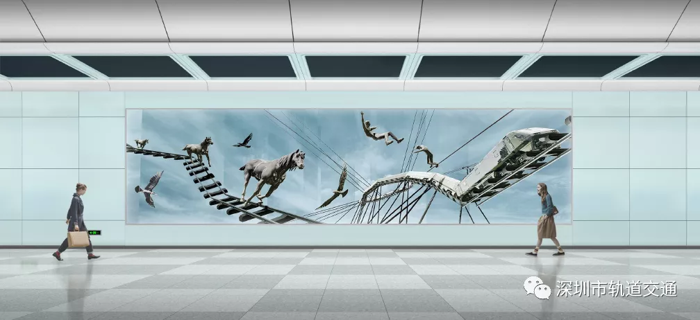 該站文化藝術(shù)墻以瓷板為材質(zhì),通過火車軌道、雄鷹、馬等元素結(jié)合,呈現(xiàn)出現(xiàn)代城市的多種元素,將城市、生態(tài)和科技的完美結(jié)合。