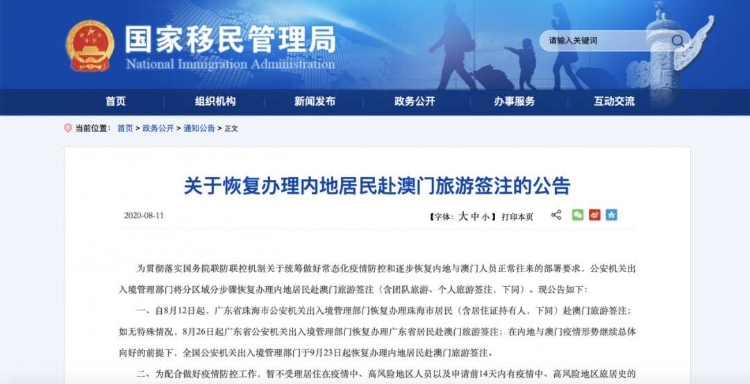 一、自8月12日起,廣東省珠海市公安機(jī)關(guān)出入境管理部門恢復(fù)辦理珠海市居民(含居住證持有人,下同)赴澳門旅游簽注;如無特殊情況,8月26日起,廣東省公安機(jī)關(guān)出入境管理部門恢復(fù)辦理廣東省居民赴澳門旅游簽注;在內(nèi)地與澳門疫情形勢繼續(xù)總體向好的前提下,全國公安機(jī)關(guān)出入境管理部門于9月23日起恢復(fù)辦理內(nèi)地居民赴澳門旅游簽注。