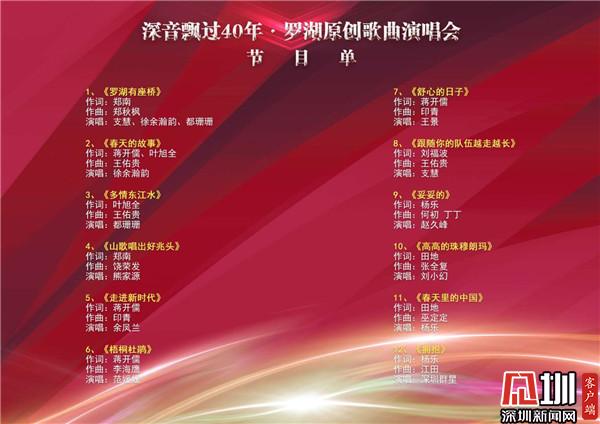 歌曲創(chuàng)作是深圳市羅湖區(qū)的強項,中國大陸的流行歌曲即由此發(fā)端。四十年來,《春天的故事》、《走進新時代》、《跟隨你的隊伍越走越長》、《山歌唱出好兆頭》等一大批膾炙人口的羅湖原創(chuàng)歌曲,經(jīng)由影視、廣播等媒體傳播,風(fēng)靡大江南北,反映了時代劇變,表達了人民心聲。此次演唱會,精選了其中的12首歌曲,由熊家源、余鳳蘭、劉小幻、范媛媛、楊樂、支慧、趙久峰、都園園、王景、徐余瀚韻等數(shù)位深圳歌唱家傾情演繹,其中既有創(chuàng)作于上世紀的歌曲,也有近年來新創(chuàng)作的歌曲,堪稱一場聲樂盛宴。
