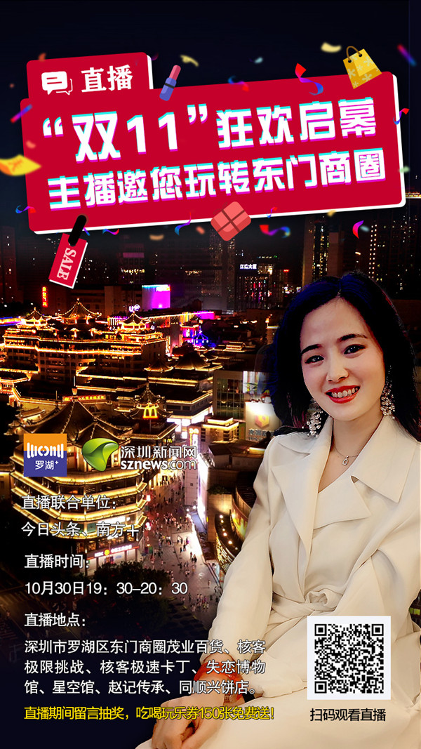 深圳新聞網(wǎng)訊(見圳客戶端、深圳新聞網(wǎng)記者 李慧 劉晨)提前探秘經(jīng)典活動“68小時不打烊”熱潮、體驗全亞洲最長的室內(nèi)索道、打卡失戀博物館、7D星空魔幻藝術(shù)館、走進(jìn)手沖姜撞奶的原創(chuàng)品牌糖水店、品嘗深圳特產(chǎn)……10月30日(本周五)晚上7:30-8:30,由深圳新聞網(wǎng)聯(lián)合深圳市羅湖區(qū)融媒體中心共同打造,聯(lián)合今日頭條、南方+直播平臺,為市民開啟東門商圈狂歡預(yù)熱,解鎖“雙十一”嗨購方式,并在直播時段每隔20分鐘抽取一次幸運網(wǎng)友,發(fā)放免費150張吃喝玩樂禮品券。