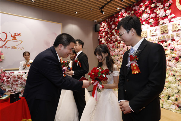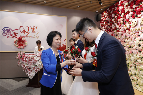 見圳客戶端·深圳新聞網(wǎng)12月12日訊(記者 李慧 通訊員 黎少忠 黃穎怡)“1212,要愛要愛!我們結(jié)婚啦!”,“雙十二”對大部分人來說是一個(gè)購物的好日子,但對打算步入婚姻的新人們來說,卻是一個(gè)不可錯(cuò)過的登記好時(shí)機(jī)。12月12日,羅湖區(qū)婚姻登記處四處洋溢著歡樂的笑聲,12對新人在滿是玫瑰花的婚姻登記處中舉行集體結(jié)婚儀式。據(jù)悉,這也是疫情以來羅湖區(qū)首場結(jié)婚登記集體頒證儀式。