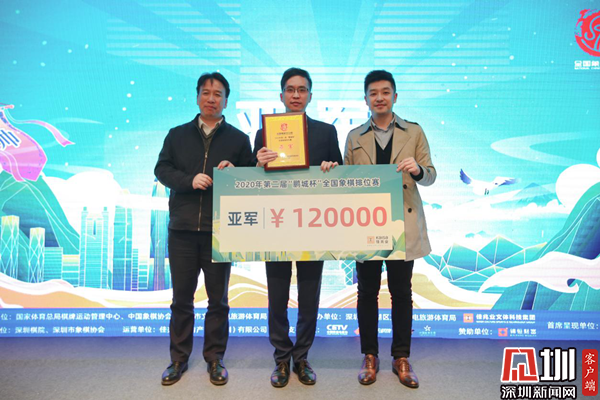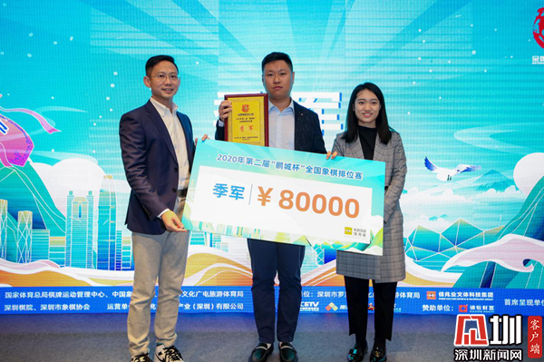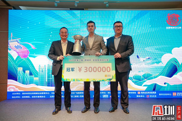 王志強與麥帆為王天一頒發(fā)今年“鵬城杯”獎杯以及30萬元的冠軍獎金。王天一表示,“鵬城杯”是國內(nèi)平均水平最高的賽事,經(jīng)過兩年成功辦賽,現(xiàn)在影響力越來越大,受到廣大棋手們和社會各方的重視,感謝深圳市文化廣電旅游體育局與佳兆業(yè)的鼎力支持。而“鵬城杯”也讓他在2020年末實現(xiàn)了一個小目標,今年唯一的一個個人賽冠軍,也實現(xiàn)了每年都能獲得一個冠軍的愿望。