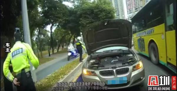 見圳客戶端·深圳新聞網(wǎng)1月21日訊(記者 郭含笑 通訊員 黃佳佳 陳慧琪)1月19日晚,羅湖交警筍崗中隊(duì)鐵騎隊(duì)員彭鉞崴、陳培斌巡邏至深圳市羅湖區(qū)泥崗路輔道轉(zhuǎn)北環(huán)大道路段時(shí),發(fā)現(xiàn)一輛煙霧彌漫著的小車突發(fā)故障,停放在路邊。站在一旁的車主神情十分慌亂,兩名鐵騎隊(duì)員立即上前了解情況,經(jīng)與該車女車主溝通,車輛水箱爆開防凍冷卻液外滲,導(dǎo)致無法正常行駛,被迫停放在此處。