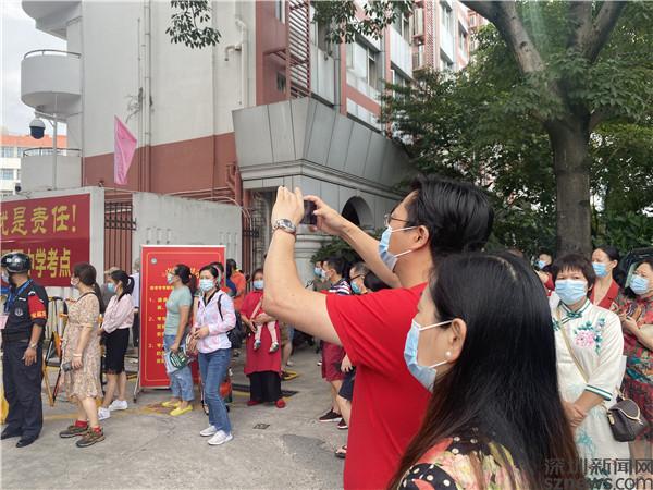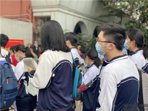當(dāng)天上午7:50,記者來到羅湖區(qū)翠園中學(xué)和羅湖外語學(xué)校門口,只見考生們已陸續(xù)排隊領(lǐng)取準(zhǔn)考證,有序進入考場。許多穿著“紅旗袍”戴著“紅口罩”的家長們在紛紛叮囑孩子們后,已在校門口等候。