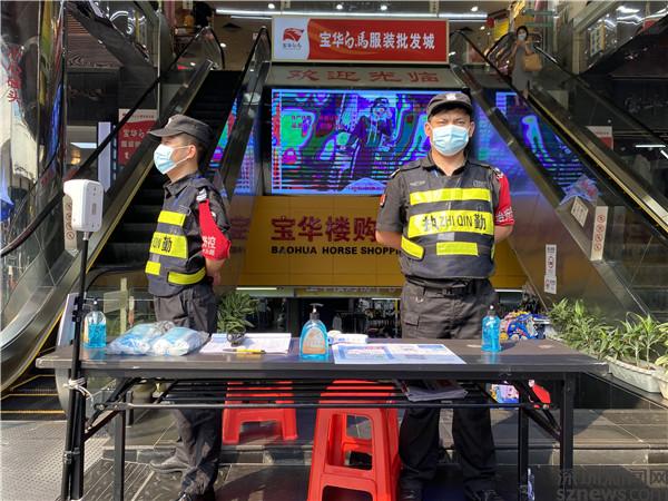 來到寶華樓門口,現(xiàn)場可見,出入口設(shè)置了體溫監(jiān)測器和免洗洗手液以及備用口罩等防疫物資,有相關(guān)人員在巡邏以及在監(jiān)督。區(qū)域內(nèi)的大部分商戶已正常營業(yè),來往市民和商家也均戴好口罩,每家商戶也在顯眼位置擺放了必要的防疫物資。