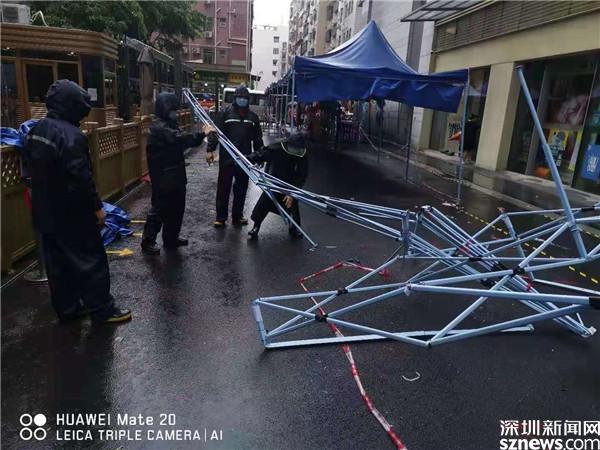6月22日早上,黃貝街道工作人員在風(fēng)雨中搭建核酸檢測點(diǎn)帳篷。