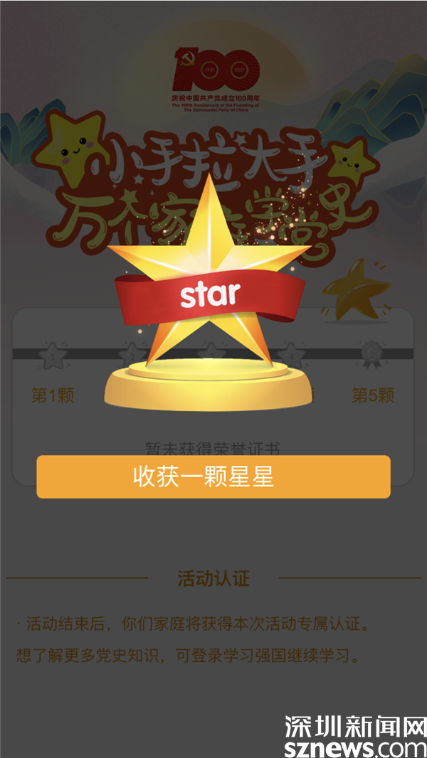 本次活動面向羅湖轄區(qū)中小學學生及家庭。6月28日至7月8日,學生及家長可以下載“羅湖Plus”APP,點擊首頁“服務(wù)”進入“小手拉大手黨史學習”活動專欄并完成注冊。活動期間,每完成1次打卡即答對全部題目,可獲得1次親子“點亮星星”的機會。每輪答題如有1道答錯即為“闖關(guān)失敗”,可以點擊“再來一次”繼續(xù)答題,直到全部答對為止。10天內(nèi)完成5次打卡任務(wù),即可點亮5顆小星星獲得“升旗手”個人榮譽證書。