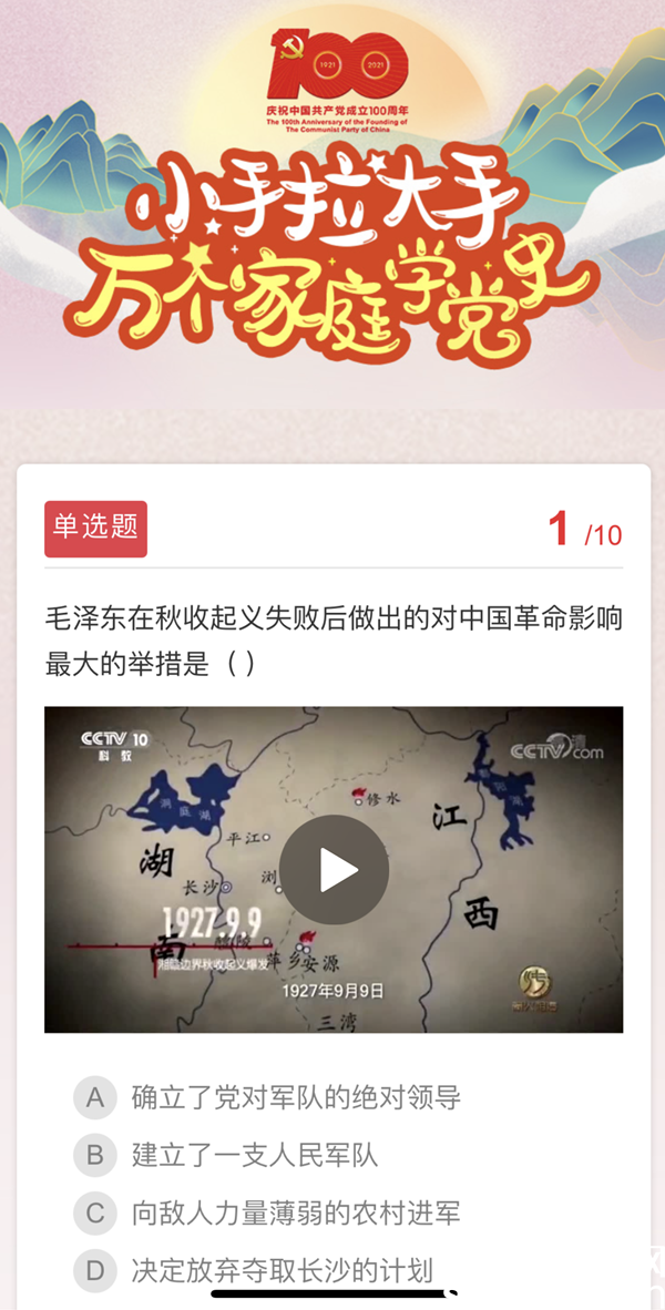 此次羅湖區(qū)率先通過區(qū)級融媒客戶端創(chuàng)新推出黨史學習教育“親子學習”模式,學生及家長共同參加,將黨史學習和家庭教育結(jié)合。題目類型上創(chuàng)新“圖+文+影”多種形式,包括看圖文答題,觀看革命題材電影片段等,題目內(nèi)容涵蓋黨史、新中國史、創(chuàng)建文明城市等。