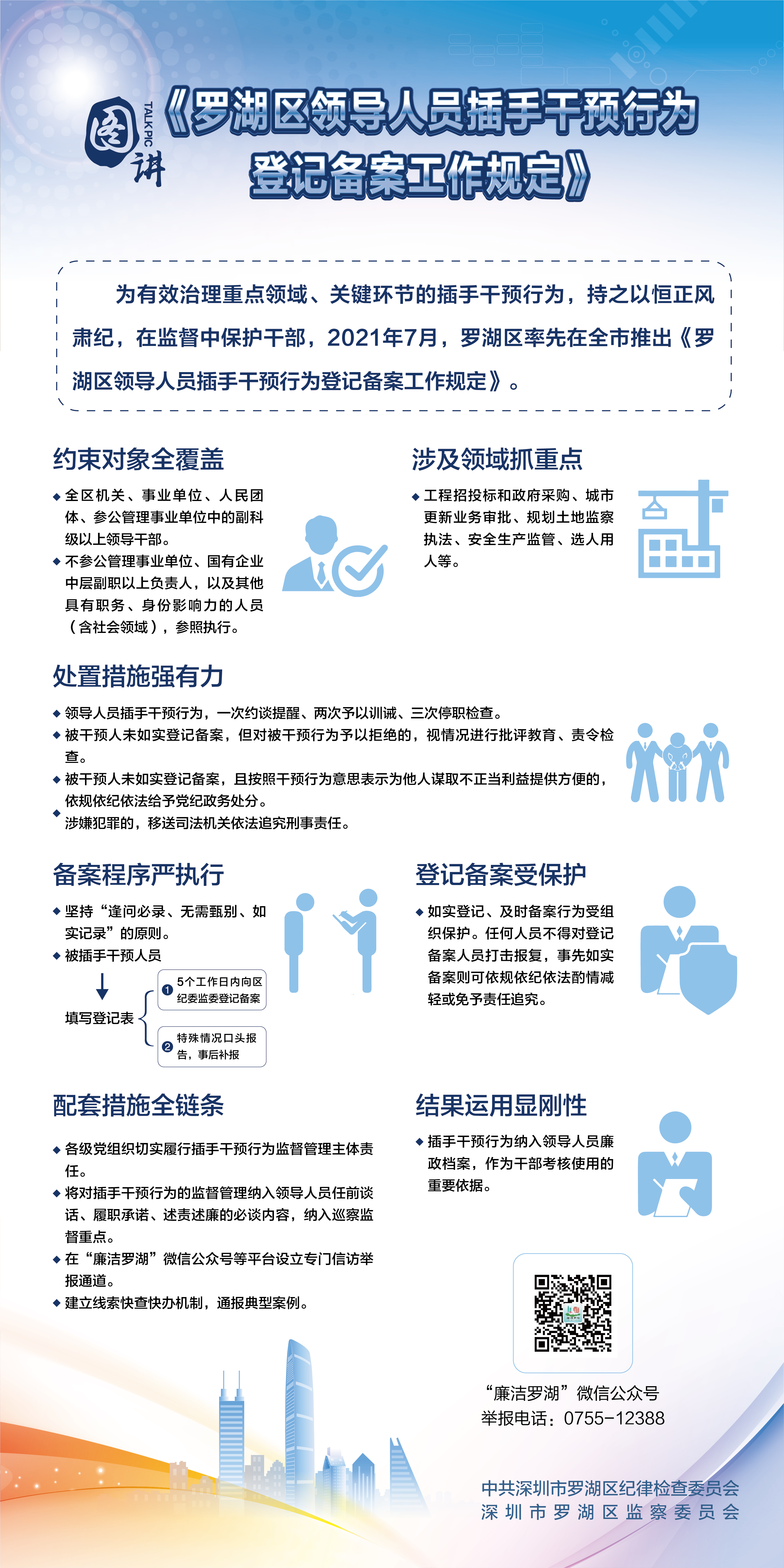 為防范廉政風(fēng)險(xiǎn),在全社會(huì)營(yíng)造不插手干預(yù)的良好氛圍,羅湖區(qū)紀(jì)委監(jiān)委推動(dòng)出臺(tái)《羅湖區(qū)領(lǐng)導(dǎo)人員插手干預(yù)行為登記備案工作規(guī)定》,從工程招投標(biāo)及政府采購(gòu)、城市更新業(yè)務(wù)審批、規(guī)劃土地監(jiān)察執(zhí)法、安全生產(chǎn)監(jiān)管、選人用人等五個(gè)重點(diǎn)領(lǐng)域入手,對(duì)全區(qū)機(jī)關(guān)事業(yè)單位和社會(huì)領(lǐng)域插手干預(yù)行為進(jìn)行約束,對(duì)“打招呼”堅(jiān)決說(shuō)“不”。