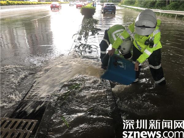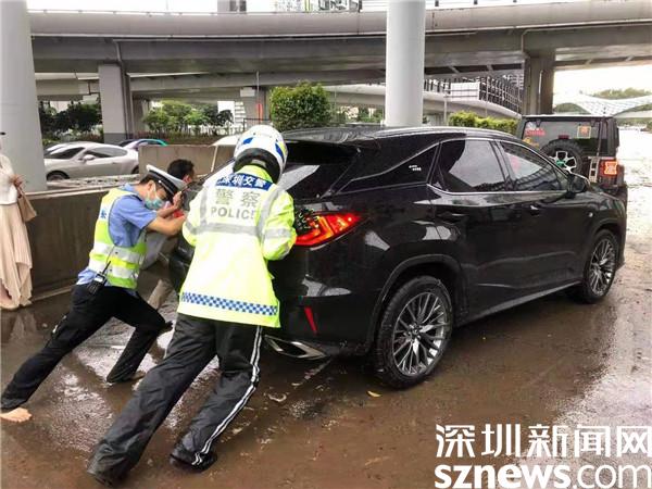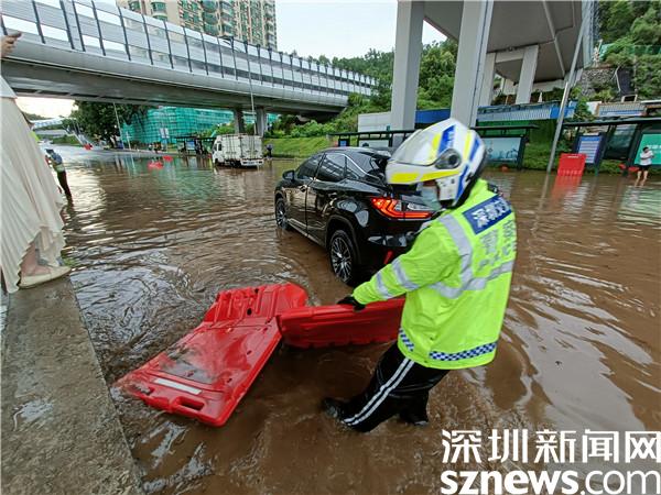 暴雨突襲,蓮塘片區(qū)羅沙路、沿河路羅芳立交積水嚴重,因排水能力較弱,許多車輛困在積水中無法通行,羅湖交警大隊機訓(xùn)中隊民警李勝軍和李作祥分別組織隊員開展救援行動。