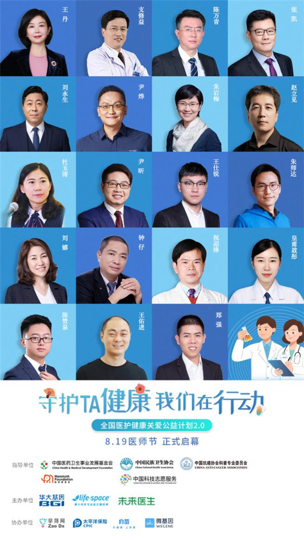 此次公益由中國醫(yī)藥衛(wèi)生事業(yè)發(fā)展基金會、中國民族衛(wèi)生協(xié)會、中國抗癌協(xié)會科普專業(yè)委員會、深圳猛犸公益基金會等機(jī)構(gòu)指導(dǎo),華大基因、Life-Space、未來醫(yī)生聯(lián)合主辦,早篩網(wǎng)、太平洋保險、約苗、微基因協(xié)辦,通過健康關(guān)懷禮包捐贈、公益科普直播、線上義診等系列活動,呼吁全社會關(guān)愛醫(yī)護(hù)人員,助力全社會形成“尊醫(yī)重衛(wèi)”的文化和氛圍;同時借助公益影響力,讓關(guān)愛輻射更廣泛人群,提高全民“早篩、早診、早治”的健康意識,助力健康中國。
