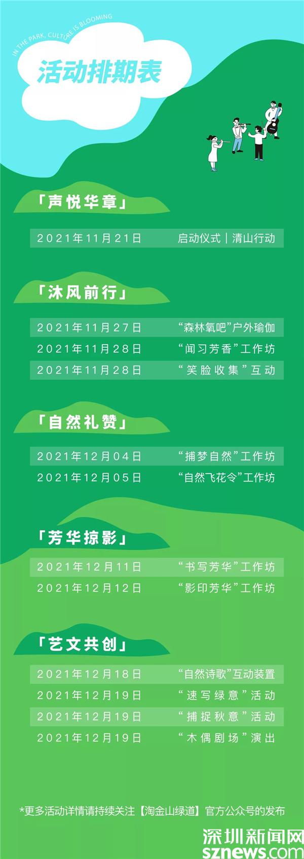 據(jù)悉,自11月27日起連續(xù)四個周末,深圳公園文化季羅湖分會場將帶來一系列健康療愈、藝術(shù)文化、傳統(tǒng)文化等戶外活動,市民可以通過關(guān)注“淘金山綠道”公眾號了解更多活動詳情,報名參加。