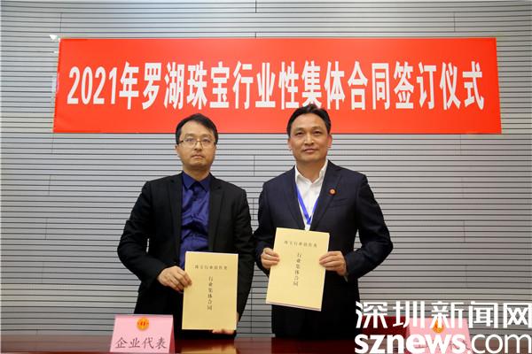 值得一提的是,本次大會還融合了職工權益保障、文明城市創(chuàng)建、企業(yè)服務等內(nèi)容。在大會現(xiàn)場,舉行了“2021年羅湖區(qū)珠寶行業(yè)集體合同簽訂儀式”。簽訂儀式上,區(qū)珠寶工聯(lián)會主席、集體協(xié)商首席代表曾志斌和羅湖區(qū)珠寶企業(yè)協(xié)商首席代表周曉航共同簽訂了《2021年羅湖區(qū)珠寶行業(yè)集體合同》,切實保障了轄區(qū)珠寶企業(yè)職工合法權益;隨后,由“廣東省五一勞動獎章”獲得者郭夷錟宣讀了主題為《攜手新征程,共創(chuàng)新未來》的行業(yè)倡議書,號召全區(qū)珠寶企業(yè)和職工,在深入學習貫徹習近平新時代中國特色社會主義思想、愛崗敬業(yè)、敢為人先、誠信經(jīng)營等方面爭做表率;同時,為更好地服務轄區(qū)企業(yè),大會特地邀請了羅湖區(qū)企業(yè)服務中心陳良同志為與會代表介紹企業(yè)服務平臺建設與運用情況。
