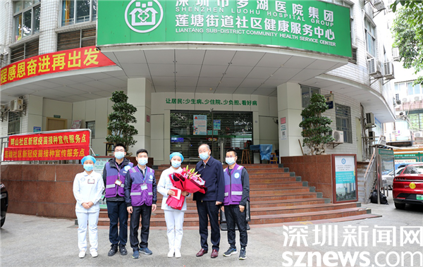 1月13日是王津原定舉行婚禮的日期,她仍然沒有例外地出現(xiàn)在蓮塘社康的采樣隊(duì)伍中。盡管不能出現(xiàn)在婚宴現(xiàn)場(chǎng),但是并肩作戰(zhàn)的社康同事給王津錄了一個(gè)祝福視頻給她祝賀,羅湖醫(yī)院集團(tuán)黨委書記、院長(zhǎng)孫喜琢也來到蓮塘社康,向依然堅(jiān)守崗位的新娘王津送上了鮮花和新婚祝福,感謝她的辛勤付出,并對(duì)所有在抗疫一線的醫(yī)務(wù)工作者表示感謝,“是你們?cè)谑刈o(hù)羅湖、守護(hù)深圳的安全,你們辛苦了!”