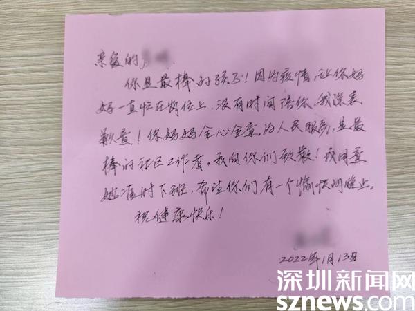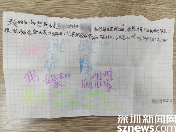 讀特客戶端·深圳新聞網(wǎng)1月13日訊(見習(xí)記者 覃鈺清 通訊員 張晴晴)“親愛的lín dǎo您好……我媽媽在您那工作,這些天都沒(méi)能陪我,請(qǐng)你讓她6點(diǎn)30分下班可以嗎?”,1月13日,羅湖區(qū)南湖街道羅湖社區(qū)黨委書記姜德榮收到了一封特別的來(lái)信。這封信來(lái)自社區(qū)工作人員彭女士可愛的女兒,信上的內(nèi)容圖文并茂,表達(dá)了一個(gè)10歲小女孩的小心愿,希望媽媽可以早點(diǎn)下班,回家陪她。