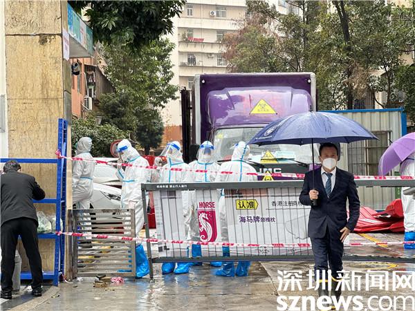 2月22日早上,記者來到處于管控區(qū)域的桂園街道鹿苑小區(qū)。只見身穿防護(hù)服的“大白”們來來往往地在門口忙碌著,偶爾有外賣小哥將外賣放在小區(qū)入口的貨架上便離開,雨水打濕了門前拉起的紅色警戒線。鹿丹村社區(qū)黨委書記陳姍姍披著簡(jiǎn)單的一次性雨衣,不斷響起的電話,居民的一聲聲詢問,都是她需要盡快處理的各項(xiàng)管控工作。
