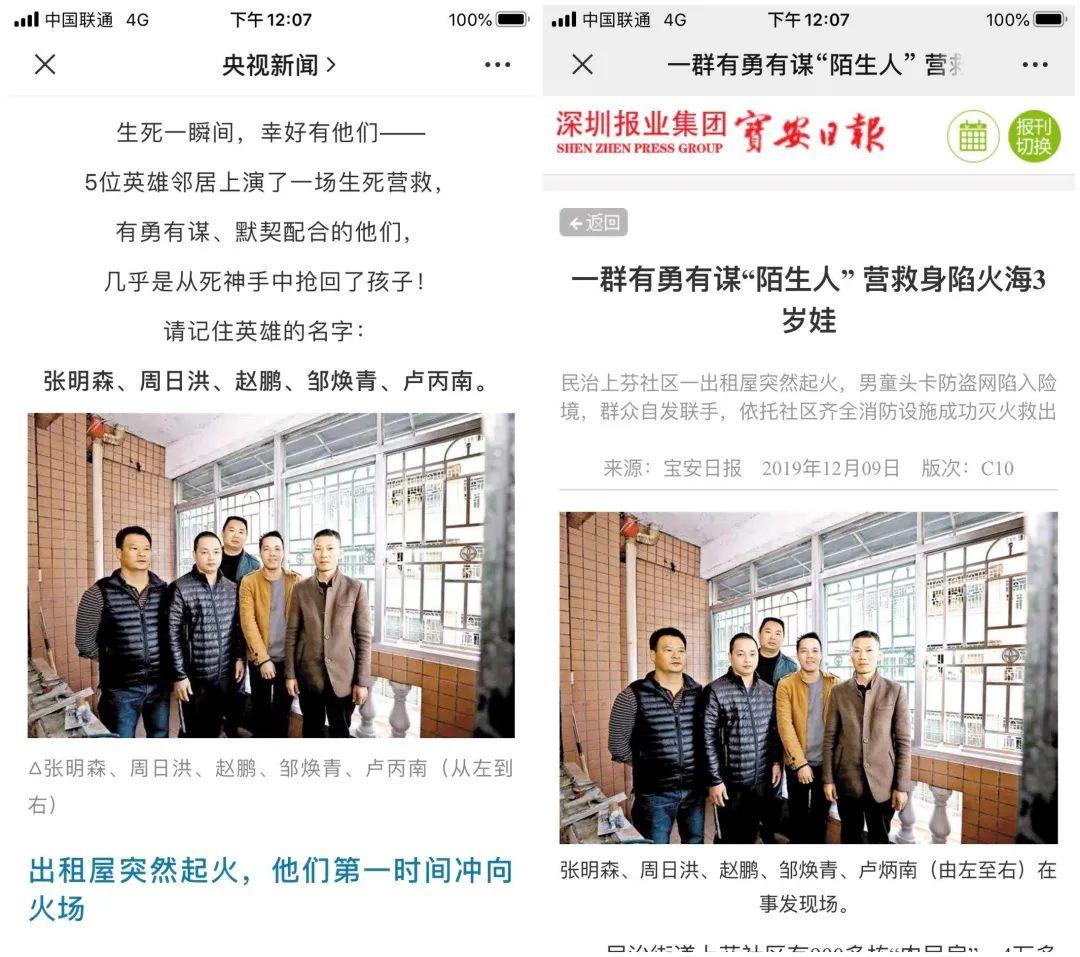 2019年12月3日,龍華區(qū)一處住宅突發(fā)大火,一名3歲幼童懸空在4樓的防盜網進退不得。生死一瞬間,幸好有一群有勇有謀的“陌生人”,上演了一場生死營救,合力救被困火場小孩(點擊回顧詳情)。