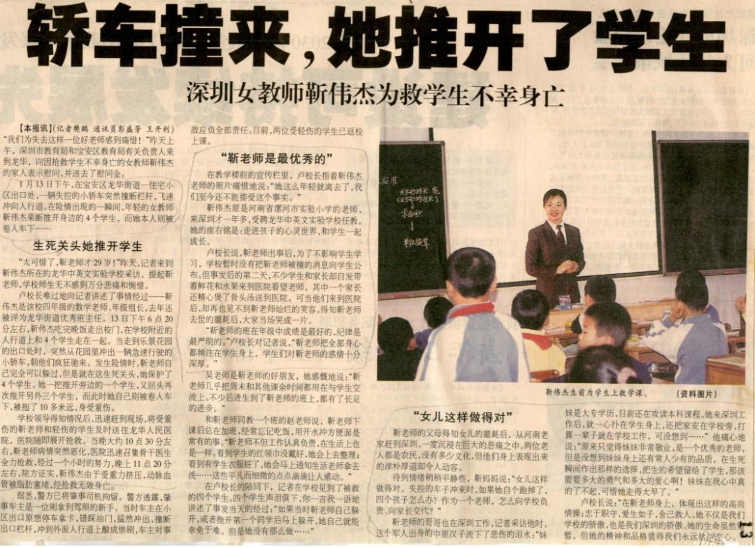 當失控的汽車沖向她和4名學生時,年僅29歲的龍華中英文學校女教師靳偉杰把生的希望留給了學生,自己卻獻出了生命。