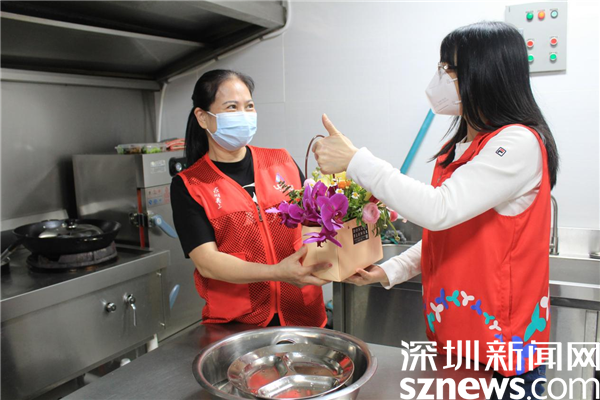 在社區(qū)廚房,老圍社區(qū)居民周文清正在忙碌,疫情開始以來,社區(qū)擔(dān)負著下沉人員和醫(yī)務(wù)人員的中餐和晚餐,每餐四五十人吃飯,任務(wù)繁重,廚師一人根本忙不過來。家住老圍花園的社區(qū)居民賴秀文、周文清得知情況后,立刻趕來幫廚,洗菜、切肉、炒菜、分裝飯盒、搞衛(wèi)生,樣樣都搶著干。羅湖區(qū)最美家庭賴秀文,一連兩個星期在社區(qū)幫廚,發(fā)揮她高超的廚藝,將每一道菜都做得色香味俱全。有了這些熱心居民的協(xié)助,一線人員得以及時吃上熱乎乎的飯菜,保障了防疫工作有序進行。她們用自己的方式參與疫情防控,為社區(qū)安寧貢獻一己之力。