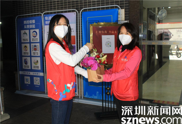 在老圍花園C2卡口,老圍社區(qū)黨委書記、婦聯(lián)主席許少瓊將花籃送到堅守在這里的居民義工陳艷芳手中,感謝她對社區(qū)疫情防控的支持。一直以來,陳艷芳只要有空就到社區(qū)做義工,核酸檢測點、小區(qū)卡口都是她的戰(zhàn)場,查驗綠碼、場所碼、督促戴口罩,測體溫,早已游刃有余,是名副其實的抗疫女戰(zhàn)士。她接過花籃,對許少瓊說,“其實社區(qū)工作人員更辛苦?!?/p>