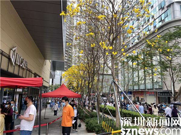 在國(guó)速中心廣場(chǎng),黃花鈴木開(kāi)得正好,藍(lán)天白云下是有序的核酸檢測(cè)隊(duì)伍,“大白”和“小藍(lán)”們正忙碌不停。據(jù)悉,這是桂園街道所屬的松園社區(qū)的一個(gè)核酸檢測(cè)點(diǎn),地處于商業(yè)旺區(qū)附近,人口較多,所以核酸檢測(cè)隊(duì)伍也相對(duì)其他核酸檢測(cè)點(diǎn)長(zhǎng)。羅湖區(qū)政協(xié)委員、深圳市國(guó)速房地產(chǎn)開(kāi)發(fā)有限公司董事長(zhǎng)黃少兵表示,這個(gè)核酸檢測(cè)點(diǎn)從1月初就設(shè)立了,“由于國(guó)速中心廣場(chǎng)較寬敞,滿足了通風(fēng)和人流需求。”