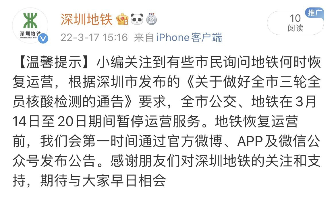 對此,記者向深圳地鐵求證,深圳地鐵表示,根據(jù)深圳市發(fā)布的《關(guān)于做好全市三輪全員核酸檢測的通告》要求,全市公交、地鐵在3月14日至20日期間暫停運營服務。地鐵恢復運營前,深圳地鐵會第一時間通過官方微博、APP及微信公眾號發(fā)布公告。