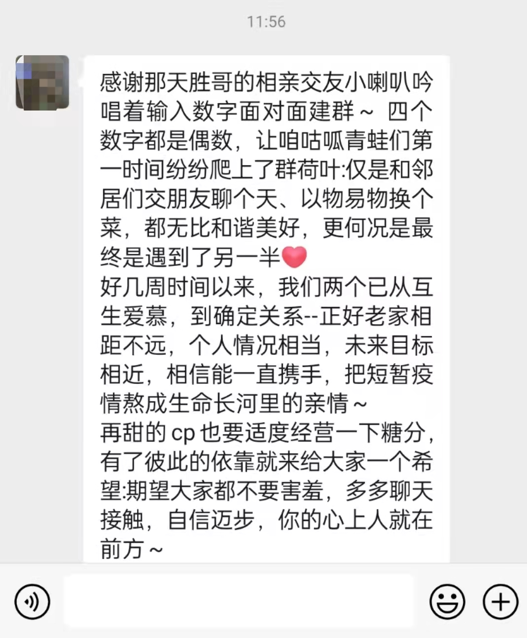 一開始單身交友群只有一個,慢慢地周邊社區(qū)越來越多人加入,群聊數(shù)量增加到了十個。由于群信息互不相通,王勝在每天做完工作后,轉(zhuǎn)發(fā)各單身青年的個人介紹、照片以及擇偶標(biāo)準(zhǔn)到十個群里,有時發(fā)成語接龍的小游戲活躍氣氛?!叭豪锏膯紊砬嗄陚兎浅7e極,大家都喜歡這種模式。我沒事的時候也經(jīng)常和他們聊聊天,讓大家隔離期間。”王勝說。