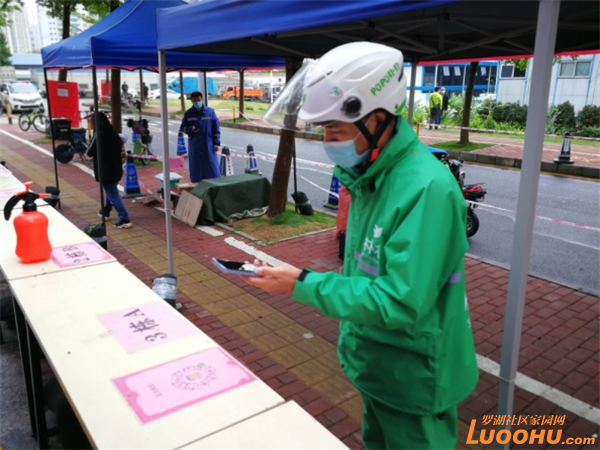 小區(qū)自建的快遞外賣臨時存放點,是由物業(yè)與居民志愿者共同管理的,分揀員主要由物業(yè)人員和業(yè)主志愿者組成。分揀員穿上防護服與快遞、外賣小哥在郵寄快遞消毒交接區(qū)進行交接,避免了所有人員與快遞、外賣小哥直接接觸,保持了有效的安全間隔。在臨時存放點可以看到由志愿者擔當著分揀員,他們有條不紊、熟練地將快遞對應放于相應樓棟的貨架上。