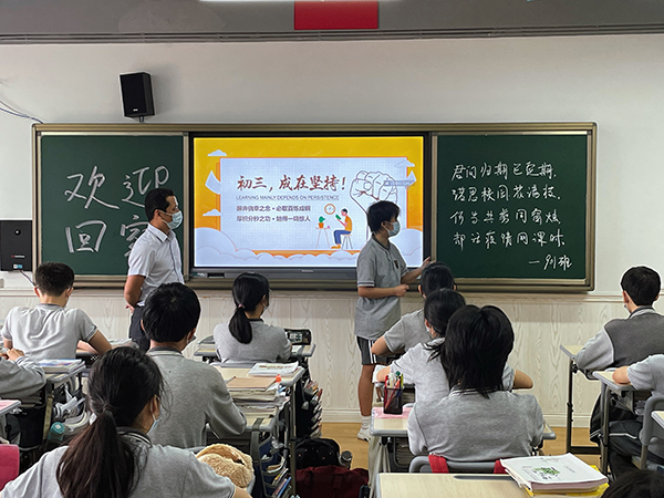 教室里,“歡迎回家”的字眼撥動學(xué)生們返校的心弦。班主任自創(chuàng)的一首無題小詩,將學(xué)生們的線上時光與線下相見相串聯(lián),潛移默化中過渡著焦慮,拉近著距離,蘊(yùn)藏著無限激勵!