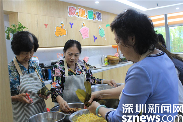 一起包粽子的30名“大廚”中,有社區(qū)居民,也有轄區(qū)企業(yè)員工。年齡最大的73歲,是老圍社區(qū)的蔡屋圍村民,年齡最小的25歲,是轄區(qū)企業(yè)員工。只見她們圍桌而立,雙手包著粽子,嘴里說著家常,臉上帶著笑,沒多大工夫,一個(gè)個(gè)有棱有角的粽子就在大盆里堆成了小山。每一顆粽子都有家的味道,都帶著滿滿的祝福和對美好生活的憧憬。不少居民在老圍社區(qū)出生長大,一住就是一輩子,她們見證了社區(qū)家園日新月異的變化,她們熱愛這塊土地,熱愛老圍社區(qū)。