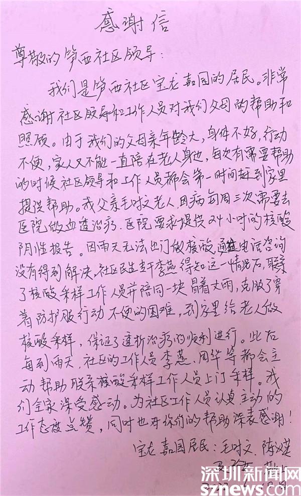 讀特客戶端·深圳新聞網(wǎng)2022年6月13日訊(記者 劉嘉敏 通訊員 李秀甜)近日,羅湖區(qū)筍崗街道筍西社區(qū)寶龍嘉園住戶毛時(shí)文的老伴陳漢英阿姨來到筍西社區(qū)工作站,送上了一封手寫的感謝信,感謝社區(qū)提供貼心的上門核酸采樣服務(wù)。