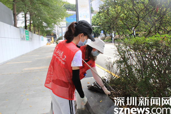 老圍社區(qū)蔡屋圍村民黃元娣和李梅英一組,她們平時是好姐妹,服務(wù)社區(qū)是好隊友。兩個人負(fù)責(zé)大劇院周圍的環(huán)境衛(wèi)生,毫不吝惜體力,花壇里的垃圾用垃圾夾不方便,就干脆用手抓。