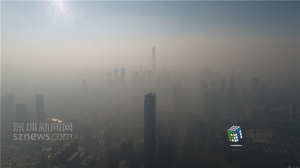 1月18日上午,記者操控?zé)o人機(jī)俯瞰深圳中心區(qū)發(fā)現(xiàn),灰霾將天空“割裂”成一道涇渭分明的界線,把城市籠罩得如同一個(gè)充滿霧靄的森林。從平安金融大廈的上空遠(yuǎn)眺,西南面的深圳灣在灰霾的籠罩下變成了一片“沙漠”,東面的京基一百幾乎被灰霾“吞沒(méi)”,北邊平時(shí)肉眼可看的梅林山也因?yàn)槟芤?jiàn)度較低變得若隱若現(xiàn),南面的米埔濕地也被云遮霧繞。