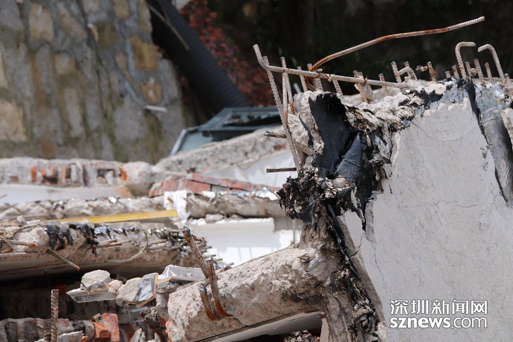記者在現(xiàn)場(chǎng)看到,違法建筑已基本拆除完畢,墻體露出鋼筋,建筑垃圾還未來(lái)得及清理??可巾斠粋?cè)的地塊略大,還修有面積不小的水塘,從山上引流的山泉水還在匯入池中,水塘旁的石桌石凳分量十足,想來(lái)當(dāng)初光是運(yùn)建材上山已是不小的工程。