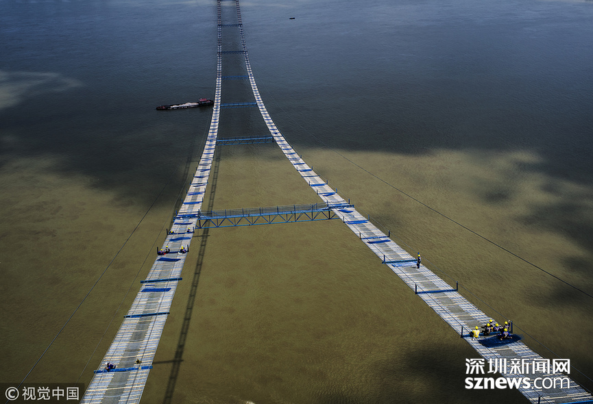 ???? 2018年5月14日,武漢,武漢楊泗港長(zhǎng)江大橋上空,上部結(jié)構(gòu)施工進(jìn)入貓道面網(wǎng)鋪設(shè)階段,數(shù)十名中鐵大橋局工人在跨江高空拼搏趕超,江面上空的臨時(shí)“吊橋”悄然形成。數(shù)十名工人在長(zhǎng)江上空228米處拼搏趕超,臨時(shí)“天梯”悄然形成。