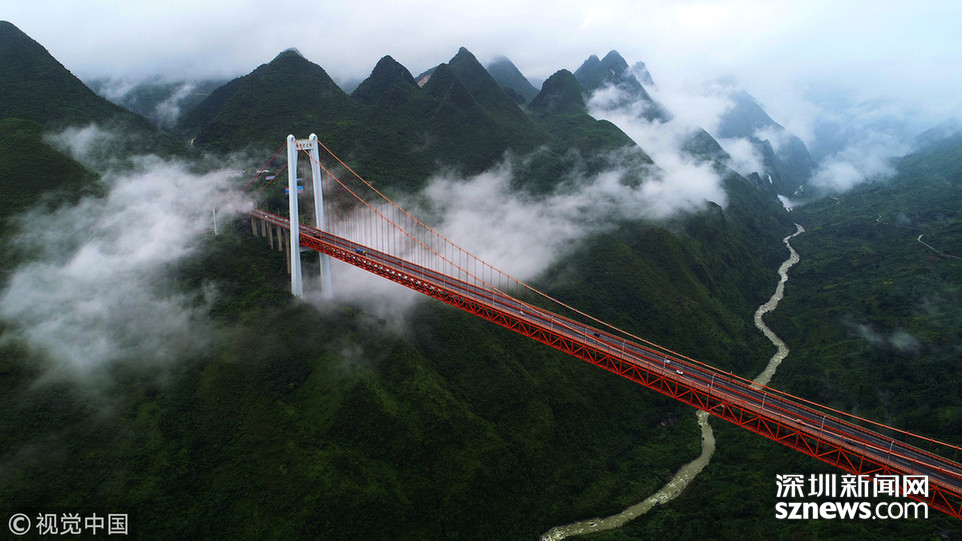 ??? 深圳新聞網(wǎng)訊? 畢都高速公路北盤(pán)江大橋是杭瑞高速公路畢都段的控制性工程,位于貴州省和云南省交界處,由貴州省和云南省共建。該橋橋面至江面高差達(dá) 565 米,成為目前世界第一高橋。主橋?yàn)殇撹炝盒崩瓨颍骺?720 米,目前位居同類(lèi)型橋梁2016 年12 月 29 日正式通車(chē)。