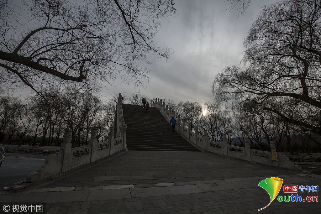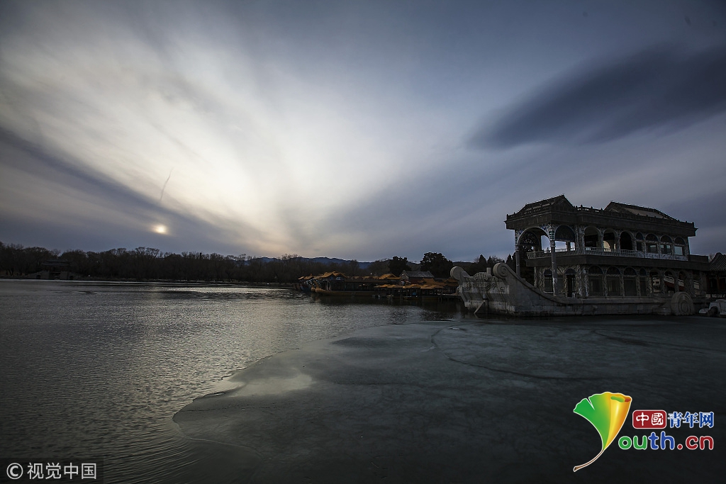 2018年2月23日,北京頤和園。當天日落時分昆明湖上空出現夕陽余暉的美景,夢幻般的色彩將古老的皇家園林裝扮得美輪美奐,讓人流連忘返。來源:視覺中國