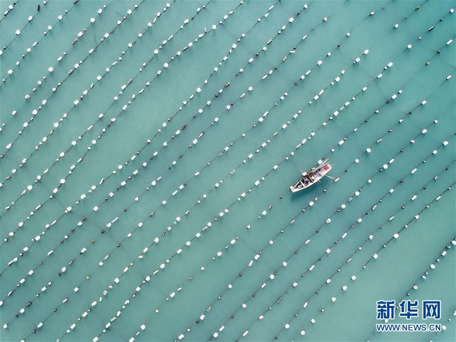 8月18日,南麂島馬祖岙海灣內(nèi),養(yǎng)殖戶乘船在貽貝養(yǎng)殖區(qū)內(nèi)作業(yè)(無人機拍攝)。進入8月,浙江省溫州市平陽縣南麂鎮(zhèn)海域上大片的大黃魚、貽貝等特色海產(chǎn)品養(yǎng)殖區(qū)域迎來豐收季節(jié),養(yǎng)殖戶們駕駛漁船在養(yǎng)殖區(qū)海域進行打撈收獲,在碧海藍天下構成了一幅“海上牧場”的美麗豐收景象。近年來,南麂鎮(zhèn)政府引導漁民養(yǎng)殖戶充分發(fā)揮“靠海吃?!钡馁Y源優(yōu)勢,大力發(fā)展海洋養(yǎng)殖經(jīng)濟和海島旅游經(jīng)濟,實現(xiàn)了南麂由“生態(tài)美”向“產(chǎn)業(yè)美”,“產(chǎn)業(yè)美”向“經(jīng)濟美”的轉變。同時該鎮(zhèn)堅持以大黃魚、貽貝等為特色產(chǎn)業(yè)支撐,精準發(fā)展高效海洋養(yǎng)殖業(yè),重點培養(yǎng)一批新型職業(yè)漁民,依靠專業(yè)技術支持,實現(xiàn)深海仿生養(yǎng)殖,讓好生態(tài)造就好品質(zhì),重點打造南麂養(yǎng)殖品牌,組建營銷網(wǎng)絡,拓展特色海產(chǎn)品市場。新華社記者 徐昱攝