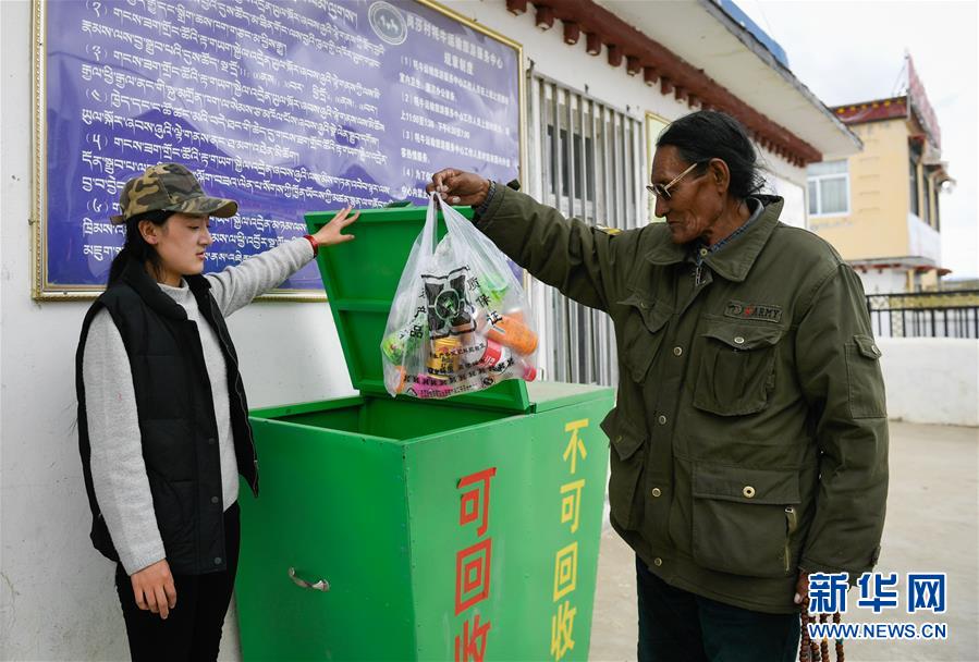 西藏阿里地區(qū)普蘭縣巴嘎鄉(xiāng)居民(右)在“垃圾銀行”兌換點(diǎn)工作人員指引下,將垃圾丟入分類(lèi)箱中(9月13日攝)。 生活垃圾1袋可兌換胸牌1個(gè),2袋可兌換鑰匙扣1個(gè),可回收垃圾1袋可兌換抽紙1包或濕巾1袋……近日,記者在西藏阿里地區(qū)普蘭縣巴嘎鄉(xiāng)神山圣湖景區(qū)看到,一些游客領(lǐng)取環(huán)保袋在景區(qū)內(nèi)撿垃圾后,拿去兌換西藏特色紀(jì)念品。 這一切,得益于當(dāng)?shù)亻_(kāi)設(shè)的“垃圾銀行”。今年6月,巴嘎鄉(xiāng)在神山圣湖景區(qū)開(kāi)設(shè)“垃圾銀行”,鼓勵(lì)游客和群眾拾撿垃圾兌換獎(jiǎng)品,破解景區(qū)垃圾收運(yùn)難題,取得良好效果。 新華社記者劉東君攝
