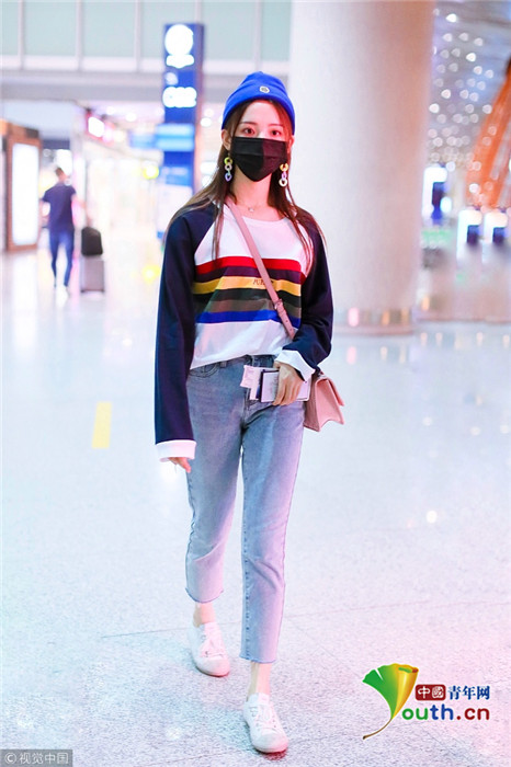 2018年9月25日,北京,“錦鯉少女”楊超越現(xiàn)身機場,她身穿“彩虹裝”青春無敵,戴著糖果色耳環(huán),細節(jié)處可愛吸睛。