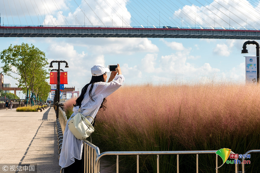 2018年9月28日,上海,東外灘楊浦濱江的粉黛亂子草目前已進(jìn)入盛花期,當(dāng)日早間,不少市民來到濱江拍照賞景,成片的紫色花海在藍(lán)天白云映襯下美不勝收。圖片作者:王岡/視覺中國(guó)