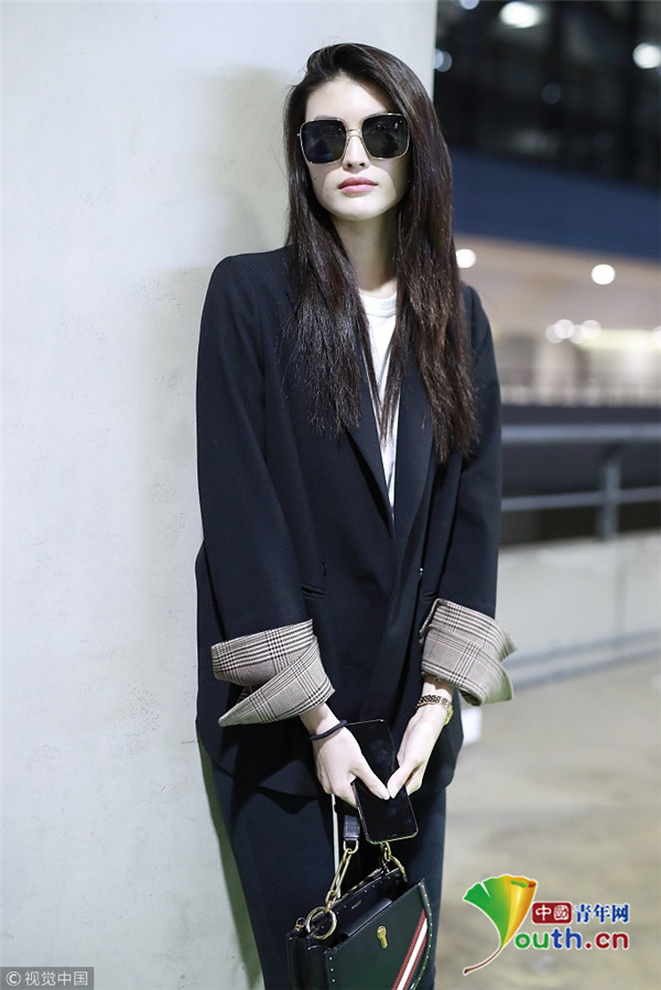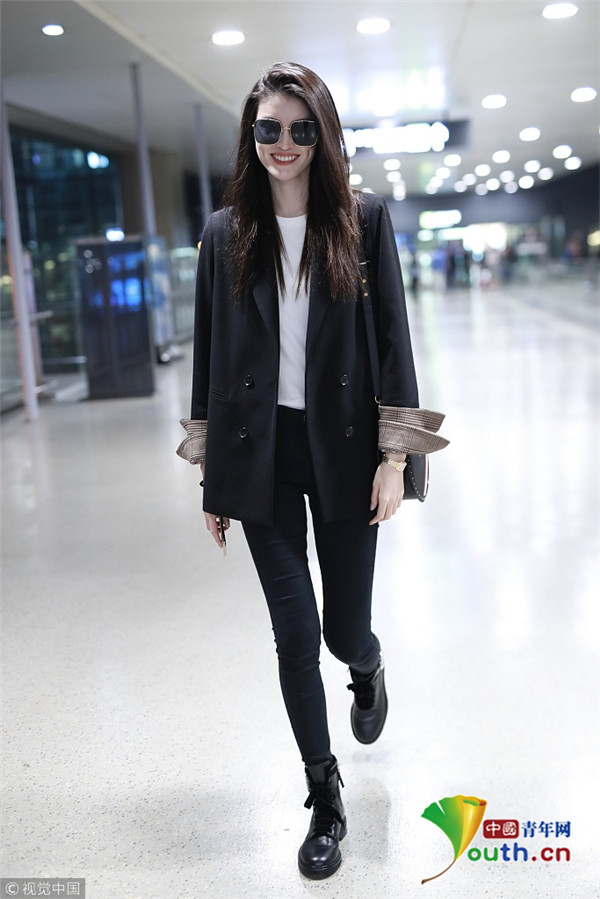 2018年10月15日,上海,何穗亮相機(jī)場。她身穿深色西裝搭配黑色緊身褲大秀超模身材,簡約造型依舊高級感十足,輕撩秀發(fā)散發(fā)女人味。